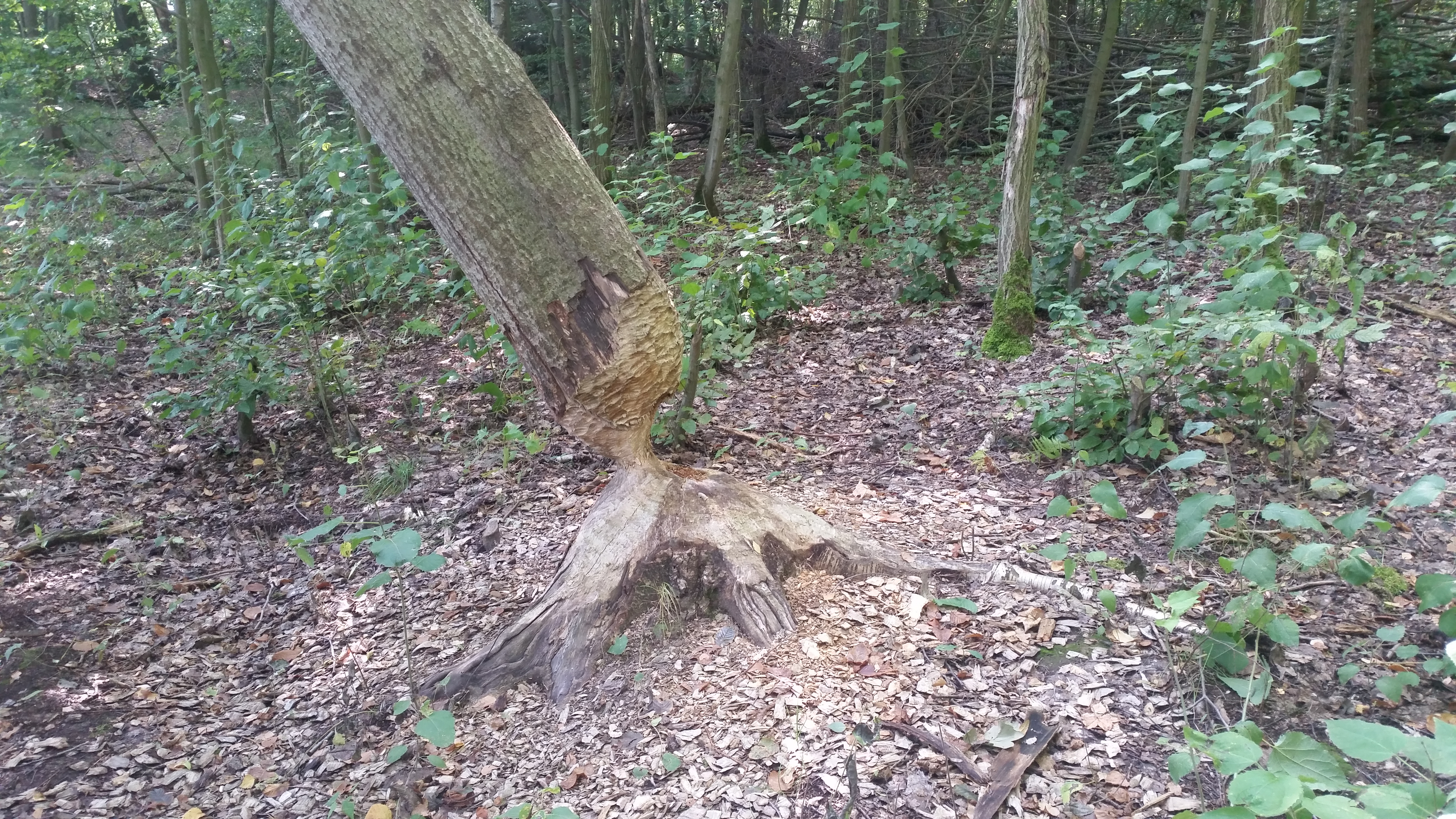 Die alten Eichen und Buchen im Gebiet sind von hohem naturschutzfachlichen Wert. Insbesondere der Hirschkäfer, der für seine Entwicklung 3 bis 8 Jahre benötigt, ist auf das Vorhandensein von morschem Holz angewiesen. Hier verbringt er als Larve die meiste Zeit seines Lebens, bevor er sich verpuppt und erst nach dem Schlüpfen als erwachsenes Insektvon Juni bis August zu beobachten ist. Das Nebeneinander von strukturreichen Laubwaldbeständen mit einem hohen Alt- und Totholzanteil sowie zahlreichen Gewässern ist zudem beste Voraussetzung als Quartier- und Nahrungshabitat für Fledermäuse. Von den 22 in Sachsen (25 in Deutschland) gezählten Arten, konnten 17 im Wermsdorfer Wald nachgewiesen werden. Dementsprechend rege ist der „Flugverkehr“ des Nachts nicht nur über den Gewässern. Tagsüber bleibt einem die Anwesenheit der flugfähigen Säugetiere dagegen verborgen. Wer aufmerksam ist, dem fallen jedoch zahlreiche aufgehängte Kästen rund um die Drei Teiche und den Doktorteich ins Auge. Bei genauerer Betrachtung sind dies nicht immer Vogelnistkästen, sondern auch Fledermauskästen. Diese bieten nicht nur zusätzlich wertvolle Quartiere, sondern dienen auch der Bestandserfassung. Wer die Tour zur Brutzeit der Vögel im Frühjahr macht und einen Nistkasten entdeckt, sollte hin und wieder innehalten und sich in entsprechender Entfernung gewissermaßen auf die Lauer legen. So lässt sich manchmal die ein oder andere Art beobachten, die man vielleicht noch nie wahrgenommen hat. Zurück zum (4) Kirchenteich bzw. zum „Teich bey der Kirchen zu Nennewitz“, wie er in früheren Schriften bezeichnet wird. Die Grundmauern besagter Kirche begegnen uns später noch auf dieser Tour. Die damals bereits wüste Siedlung Nennewitz dagegen versank mit Anlage der Teiche im 16. Jahrhundert im Wasser. Kaum vorstellbar, wenn man auf dem Damm zwischen Kirchenteich und Drei Teiche steht und über die Wasserflächen blickt. Der Weg über den Damm wird von mächtigen Eichen gesäumt, die älteste wird auf etwa 400 Jahre geschätzt. Blicken wir etwas genauer zum Ufer der Drei Teiche hinab, zeugen zahlreiche Spuren an den Gehölzen vonder Anwesenheit eines weiteren dämmerungs- und nachtaktiven Bewohners. Der Biber fühlt sich hier natürlich sehr wohl und so muss man nach Nagespuren und Biberrutschen (Ein- und Ausstiege zum Gewässer) auf dieser Tour nicht einmal suchen. Die Biberburg ist dagegen, auch wenn sie nicht unbedingt versteckt liegt, nicht ganz so leicht auszumachen.