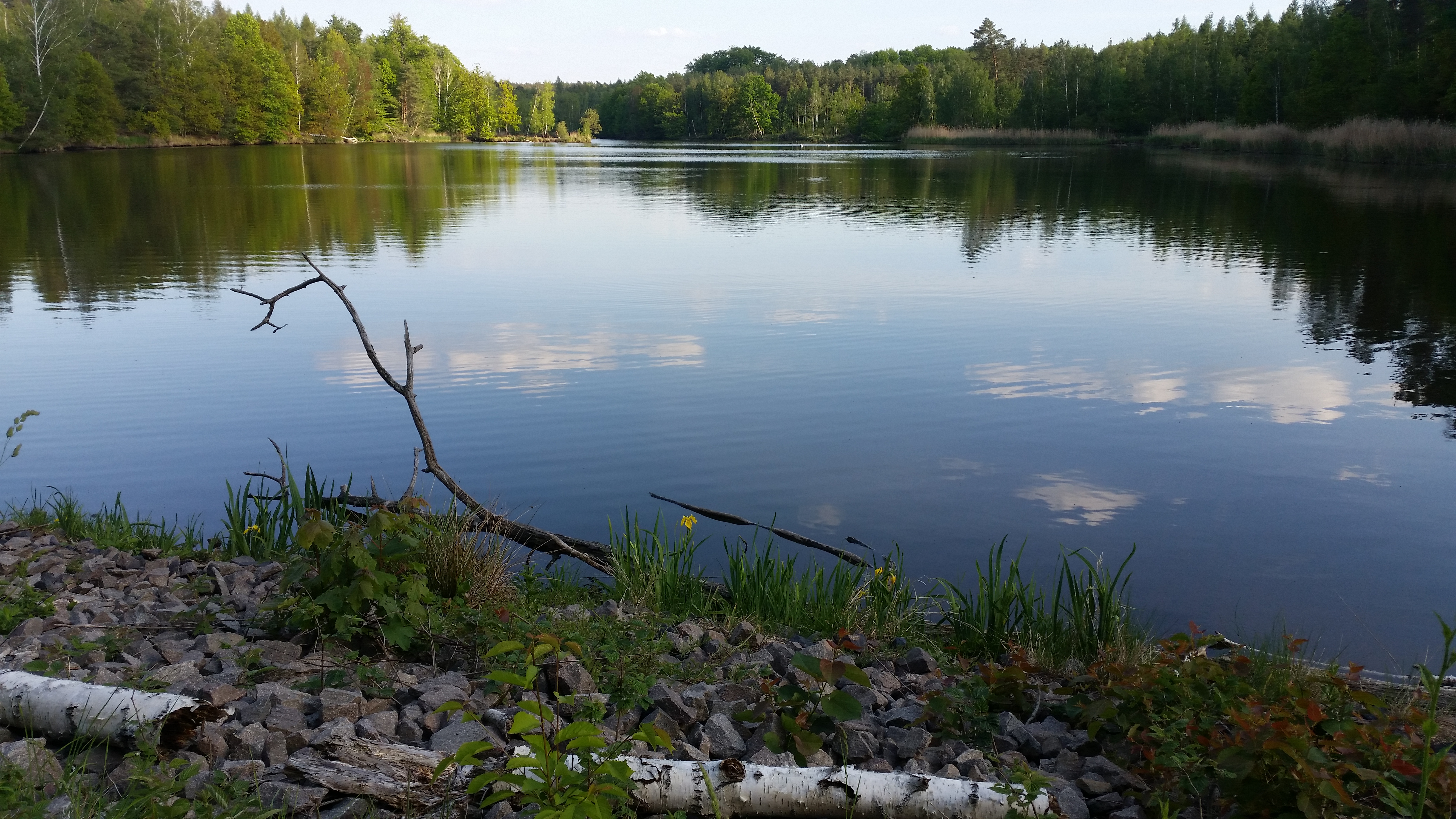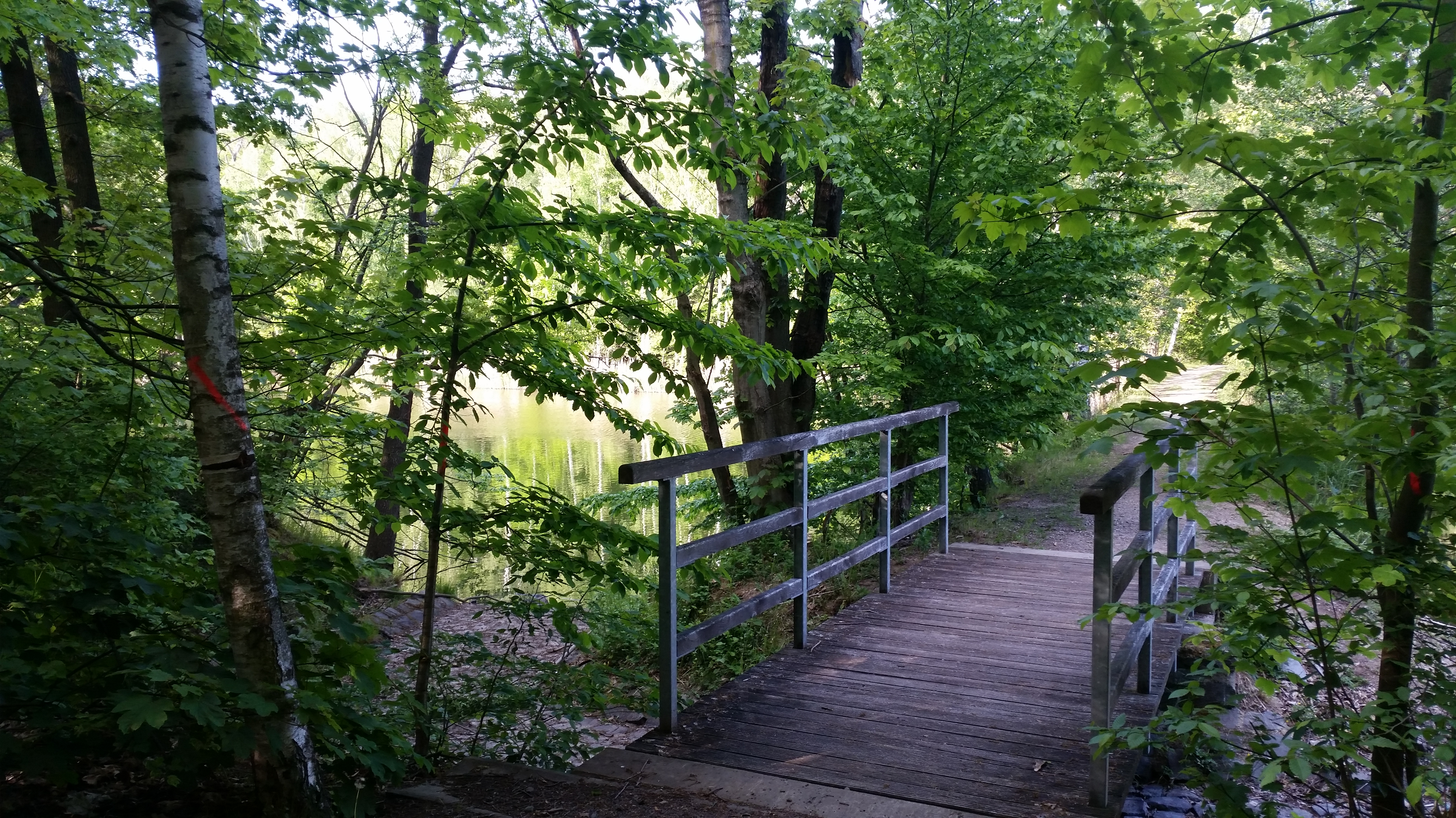 Wir laufen weiter auf dem Weg entlang des Ostufers bis dieser direkt auf den Doktorteich stößt. (8) Hier besteht die Möglichkeit, die Umrundung des Doktorteichs auszulassen und dem Weg nach links Richtung Gräberfeld zu folgen. Wir möchten jedoch noch den Reiherteich in Augenschein nehmen und biegen daher nach rechts ab. In einer langgezogenen Linkskurve geht es nun ohne Blickkontakt zum Wasser etwa 500 Meter durch den Wald. (9) Der Weg teilt sich noch einmal und wir halten uns links in Richtung Ausschilderung Waldhof und Dornreichenbach. Nach ein paar Metern eröffnet sich rechterhand ein malerischer Blick auf den Reiherteich. Links des Weges ist durch die Bäume auch der Doktorteich wieder zu sehen. Da wir diesen umrunden wollen, biegen wir an den nächsten (10) Wegkreuzungen und -gabelungen stets linksab.