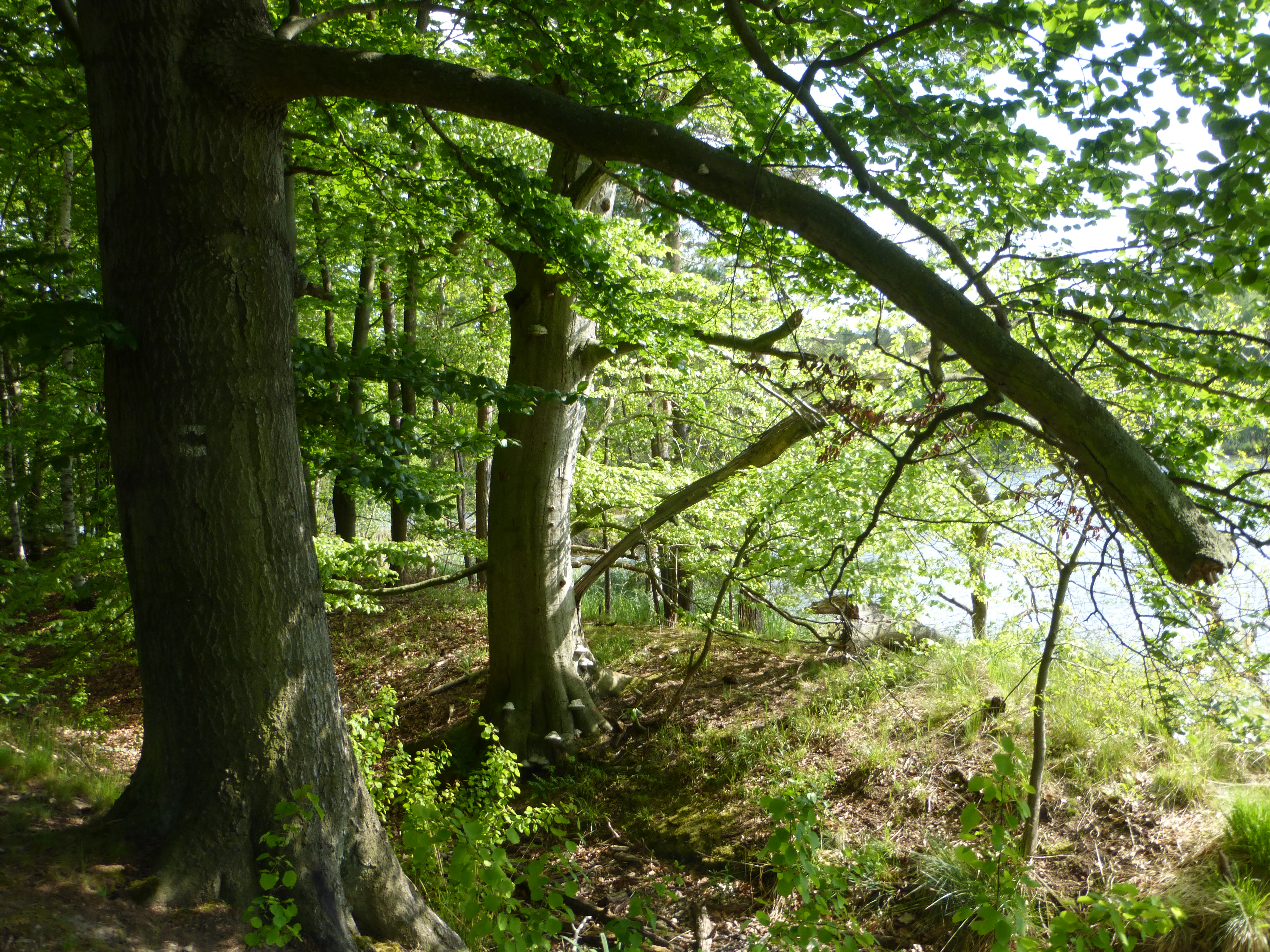 Bevor sich der Kirchenteich vor uns eröffnet, fallen im Waldbestand links des Weges mächtige alte Buchen in unser Blickfeld. Sie bilden neben Eichen und Kiefern den Hauptanteil der Laubmischwälder des Wermsdorfer Waldes. Im Wermsdorfer Wald wird bereits seit 95 Jahren Waldumbau betrieben. Der Wald unterliegt generell im Hinblick auf den Klimawandel sich ändernden ökologischen Rahmenbedingungen. Gleichzeitig sind die gesellschaftlichen Anforderungen sehr vielfältig. Lärmfilter, Temperaturregulator, Wasserspeicher, Holz und Nahrungslieferant, Erholungsort und Lebensraum - ein Wald erfüllt viele Funktionen. Die in den vergangenen Jahrhunderten entstandenen Wälder können dies nicht überall in ausreichendem Maße gewährleisten. Daher soll mit dem Waldumbau von Nadelbaumreinbeständen in mehrschichtige Mischwälder die Nachhaltigkeit aller Waldfunktionen dauerhaft gewährleistet werden. Auf der Hälfte der Waldumbaufläche im Wermsdorfer Wald sollen zukünftig wieder Eichen wachsen. Die Eiche kommt mit den vorherrschenden Bodenverhältnissen am besten zurecht und ist zudem die Hauptbaumart, die von Natur aus ohne Einfluss des Menschen hier vorkommen würde. Neben Buche und Eiche sind als Laubbäume Birke, Hainbuche, Aspe, Linde, Esche und Ahorn im Waldgebiet zu entdecken. Bei den Nadelgehölzen spielt die, zu Beginn des 20. Jahrhunderts dominierende, Fichte neben der Kiefer nur noch eine untergeordnete Rolle.