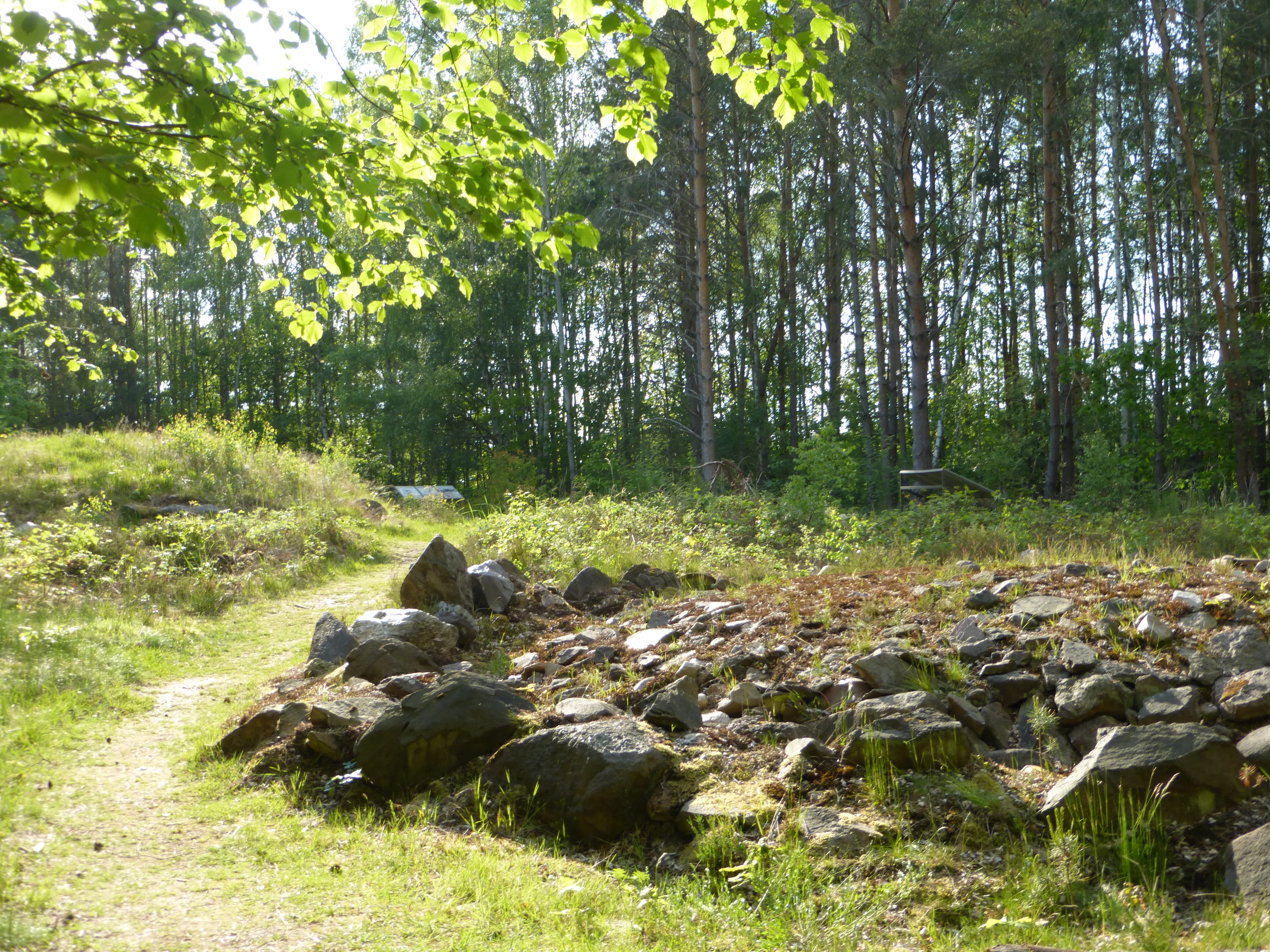 Am Südufer des Doktorteichs befindet sich ein (11) bronzezeitliches Gräberfeld mit hügelgrabartigen Steinmalen und Steindecke, welches vom Weg aus ausgeschildert und über einen schmalen Pfad zugänglich ist. Zurück auf dem Hauptweg lädt eine kleine (12) Rasthütte am Wegesrand zum Verweilen ein. Hier gabelt sich der Weg. Wir biegen rechts ab, lassen den Doktorteich hinter uns und sind zurück an den Drei Teichen. Entlang des Nordufers haben wir nochmals einen freien Blick auf die Wasserfläche. Unsere Tour führt uns nun ein Stück weit auf dem bereits bekannten Weg am Ostufer der Drei Teiche entlang bis zum (6) Damm, auf dem wir das Gewässer Richtung Westufer überqueren können. Die Teiche im Rücken führt uns ein schmaler Pfad wieder in den Wald hinein und immer geradeaus zurück zum Parkplatz. Es lohnt sich jedoch, die ausgeschilderten Ruinen der (13) Burg und der (14) Kirche nicht links liegen zu lassen.